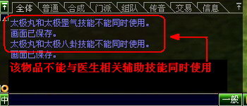 1.该物品不能和医生辅助技能“”一起使用,如果已经使用物品,则医生在使用“”技能的时候是无效的。如果已经有了医生给加的“”,那么使用物品的时候系统会提示“太极丸和XX技能无法同时使用”