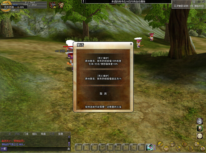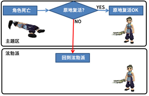 人物在副本中死亡可选择是否原地复活,如果选择是,复活后角色可继续在该房间继续练级。如果选择否,系统会自动将人物带回到泫勃派。