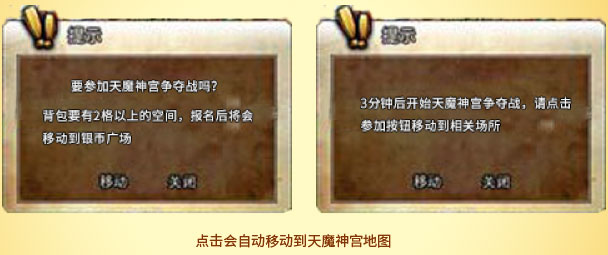 攻城战开始前五分钟,所有门派成员会收到提示通知,点击通知窗口即可进入天魔神宫。