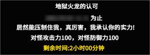 A:“地狱火龙的认可”BUFF效果:对怪攻击力+100,对怪防御力+100(持续时间2小时)。