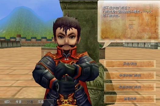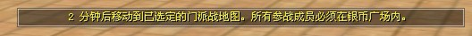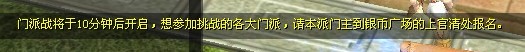 1. 门派战开始前,系统会在全区全服以公告形式告知玩家:10分钟后开启门派战,想参加的门主们请到银币广场的上官清处申请参加。