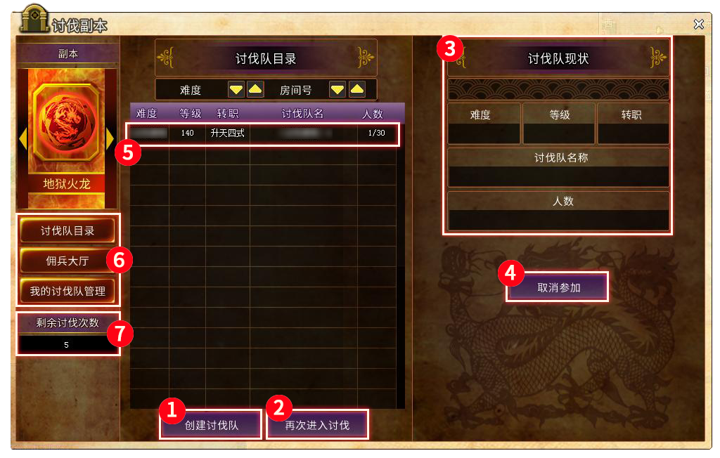 ⑥佣兵大厅:等待组队角色;我的讨伐队管理:可查看队员相关信息。