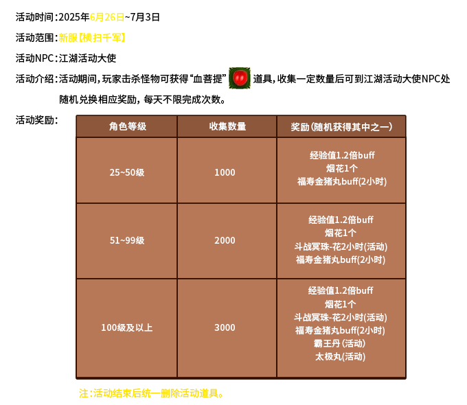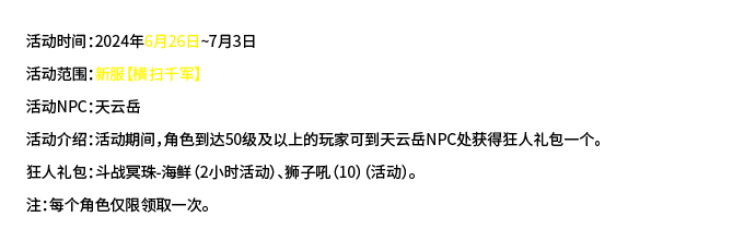活动规则:新服【横扫千军】冲级挑战活动从2025年6月26日开服后开启,玩家可以自己选择喜欢或熟练的
